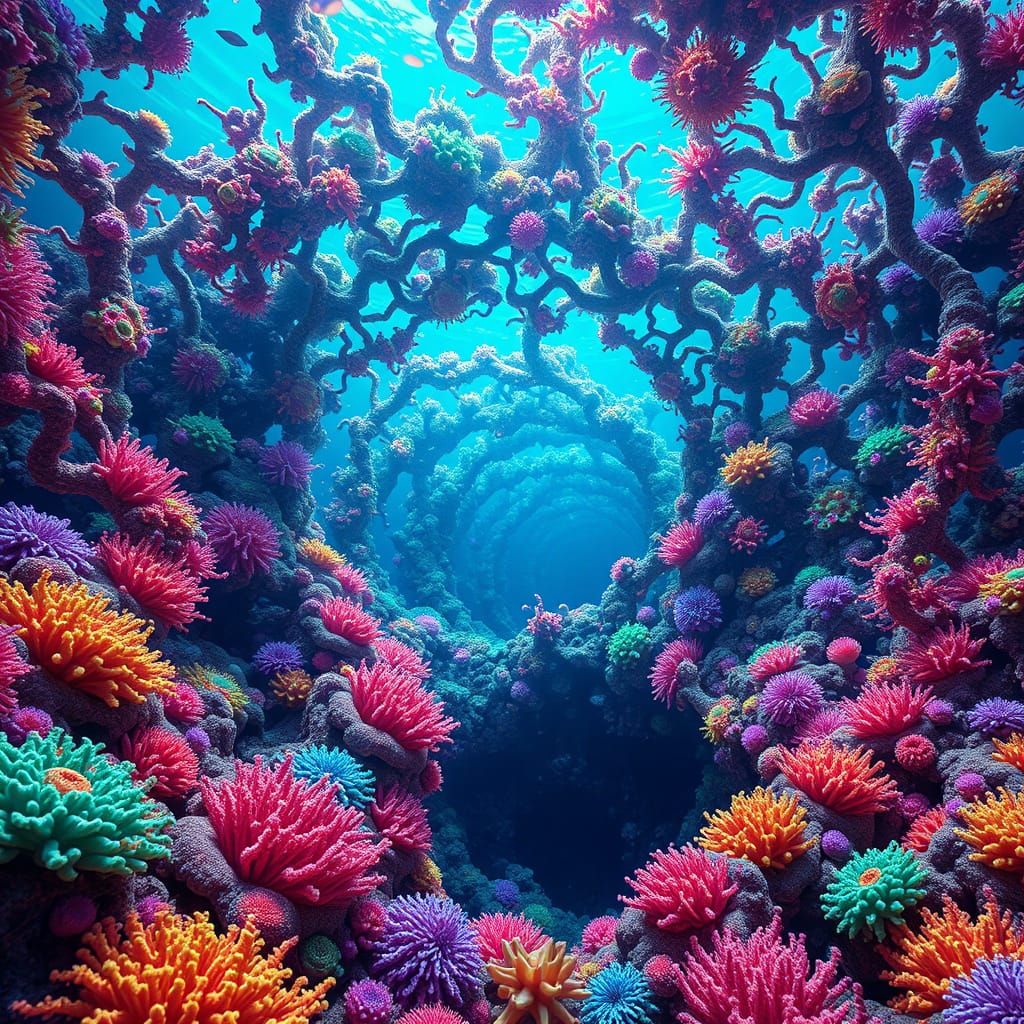 Dive into the unknown! Create your own colorful and intricate deep-sea floral vortex with our free AI image generator.