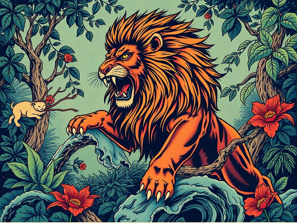 This image shows a mighty lion in a jungle setting. The artwork is in the style of a colorful linocut print, reminiscent of traditional Japanese art with some modern illustrative elements.