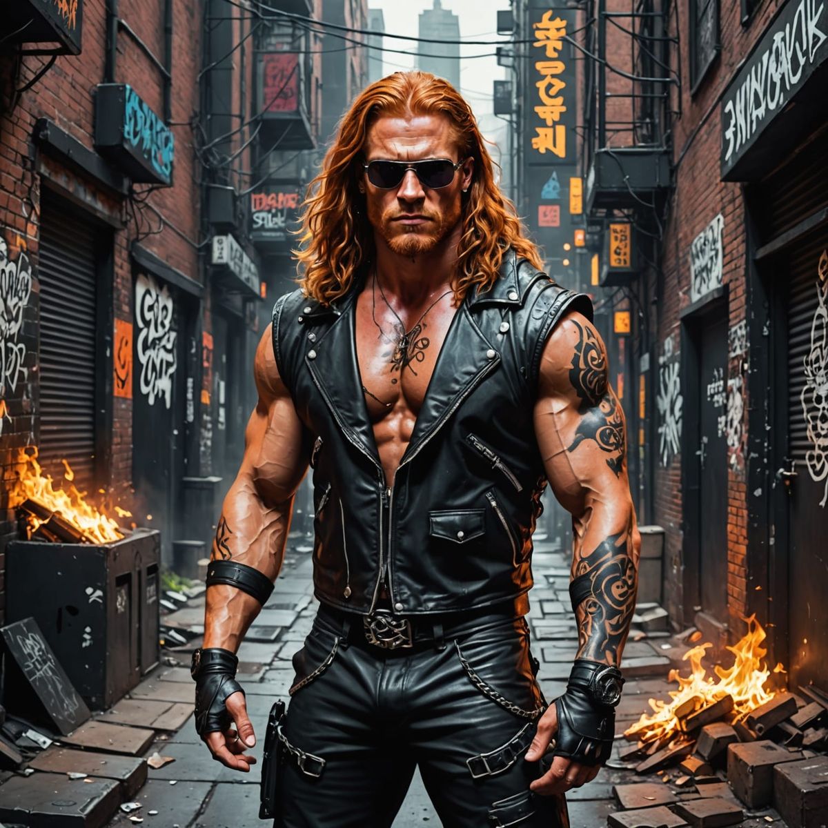This image shows a muscular, red-haired wrestler with flame tattoos in a cyberpunk alley. The scene, reminiscent of a heavy metal album cover, features neon signs, graffiti, and dramatic cinematic lighting.
