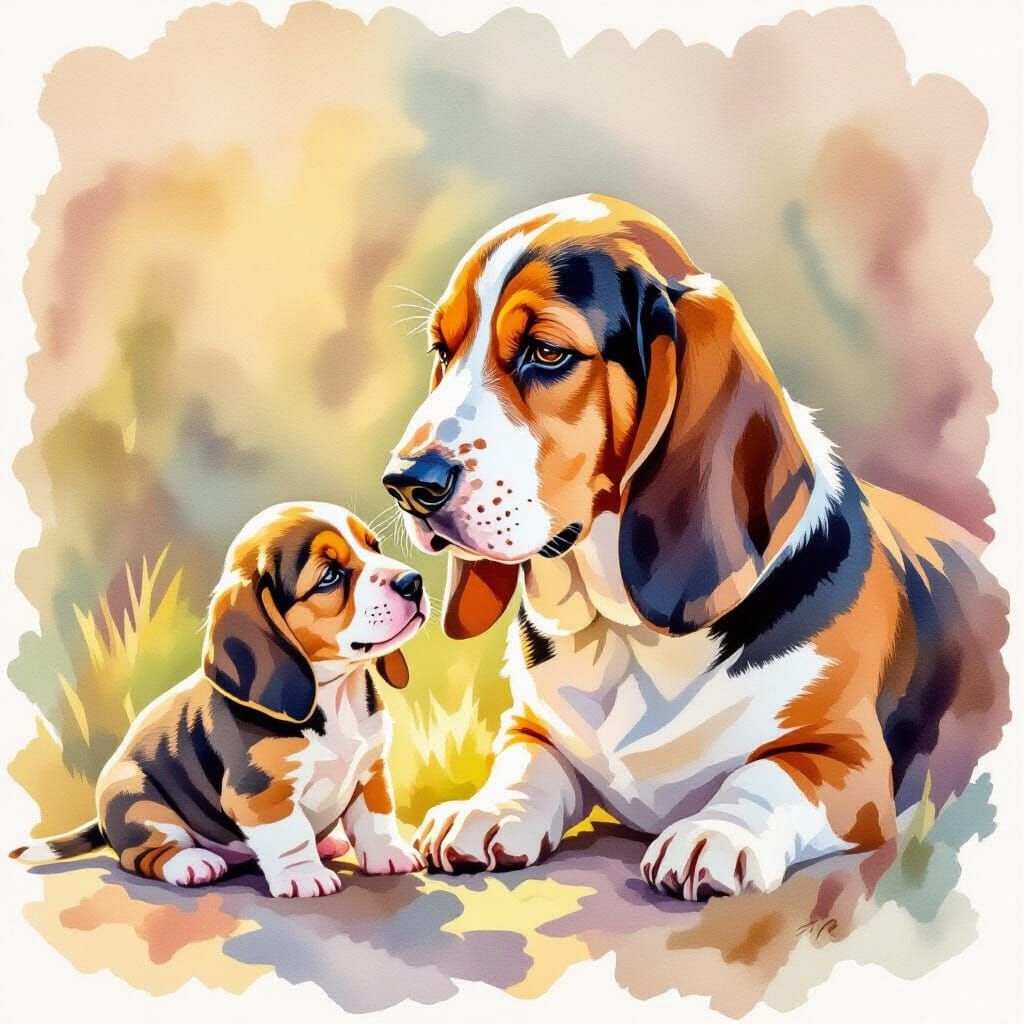A tender watercolor painting captures a Basset Hound gazing at her puppy. Loose brushstrokes and bleeding colors create an expressive, warm atmosphere with dappled sunlight.