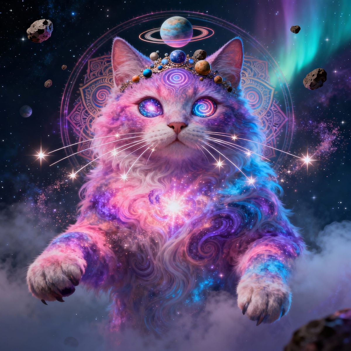 This hyperdetailed digital art depicts a massive celestial cat deity in deep space. Its form is a nebula with galaxy-filled eyes and a crown of planets, radiating supernova light. Rendered in a surreal, cosmic style.