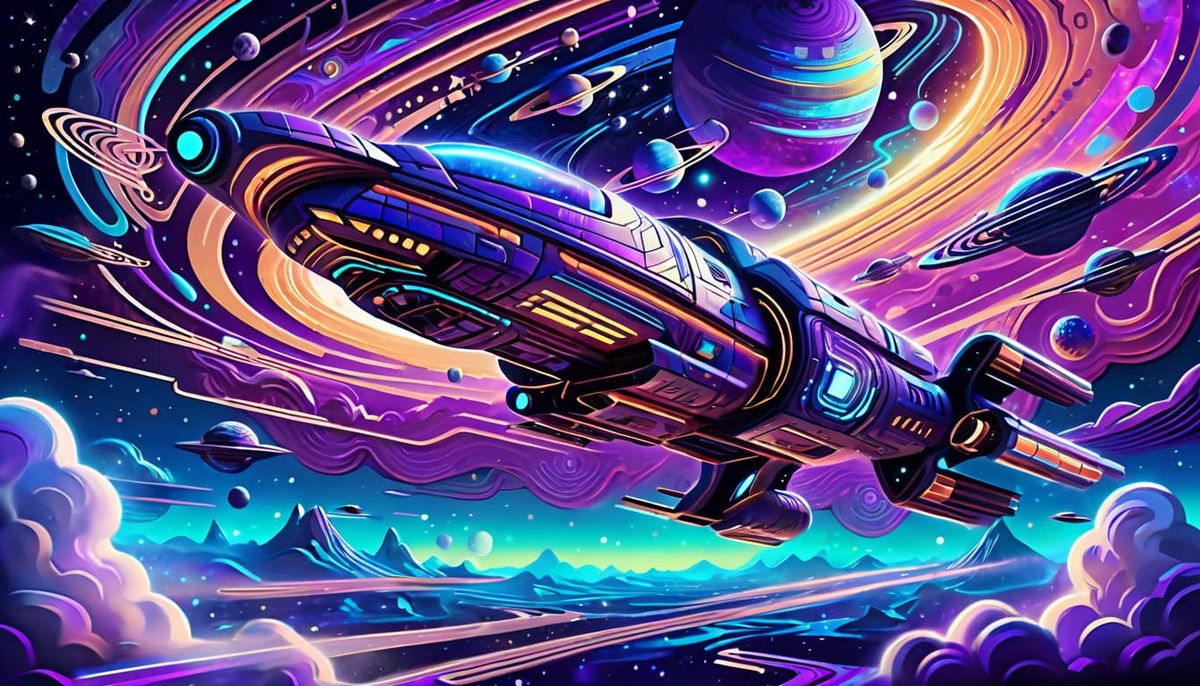 This image shows a spaceship soaring through space amidst swirling purple clouds. The digital painting features neon blue accents, a starry night sky, and dynamic lighting in a geometric abstraction style.