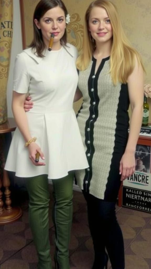 A vibrant pin-up style illustration of two women in elegant clothing and thigh-high boots smoking cigars. The image features dramatic lighting and bold lines, in a whimsical art style.