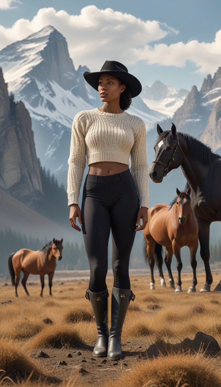 This image shows a confident black woman surrounded by horses and mountains, exuding rugged elegance in a stylish outfit.