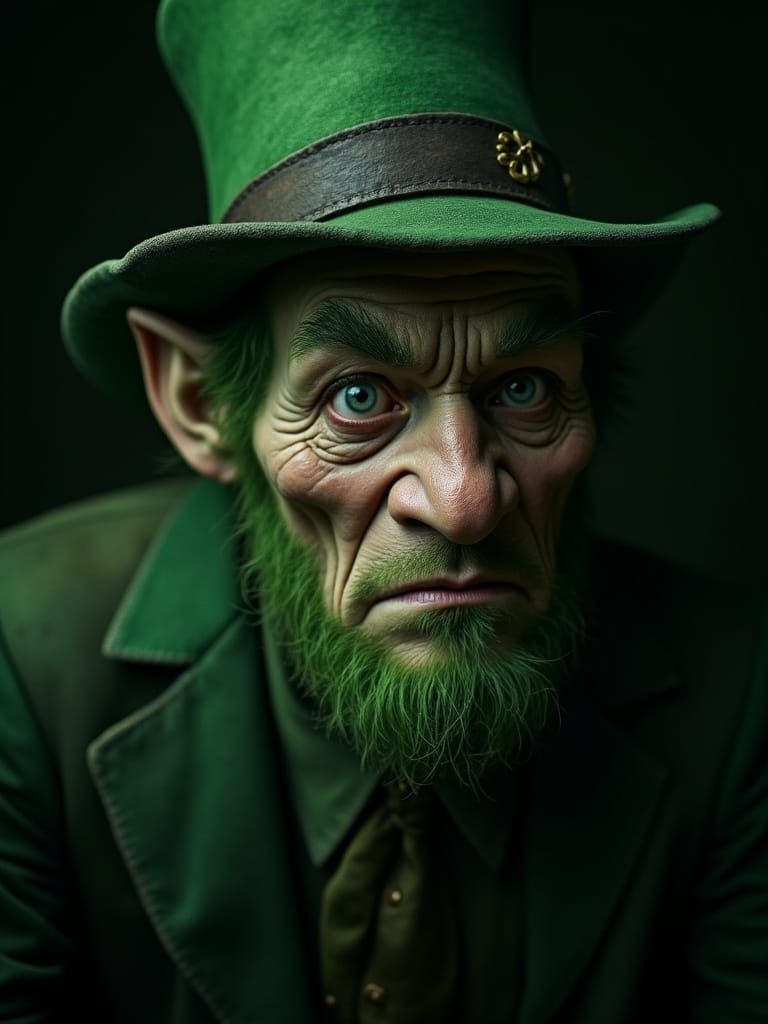 This image shows a poignant, cinematic portrait of a leprechaun with wrinkled features, set against a dark background and infused with a somber, melancholy mood.