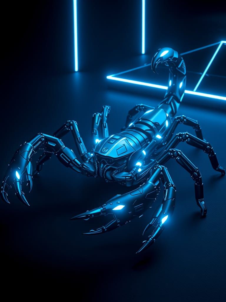 This digital art piece depicts a menacing cybernetic scorpion in a dark, high-contrast environment, its exoskeleton a labyrinth of intricate mechanical details and glowing metallic surfaces. Neon blue accents and a lattice of lights create an eerie ambiance, embodying the darker aspects of sci-fi where t...