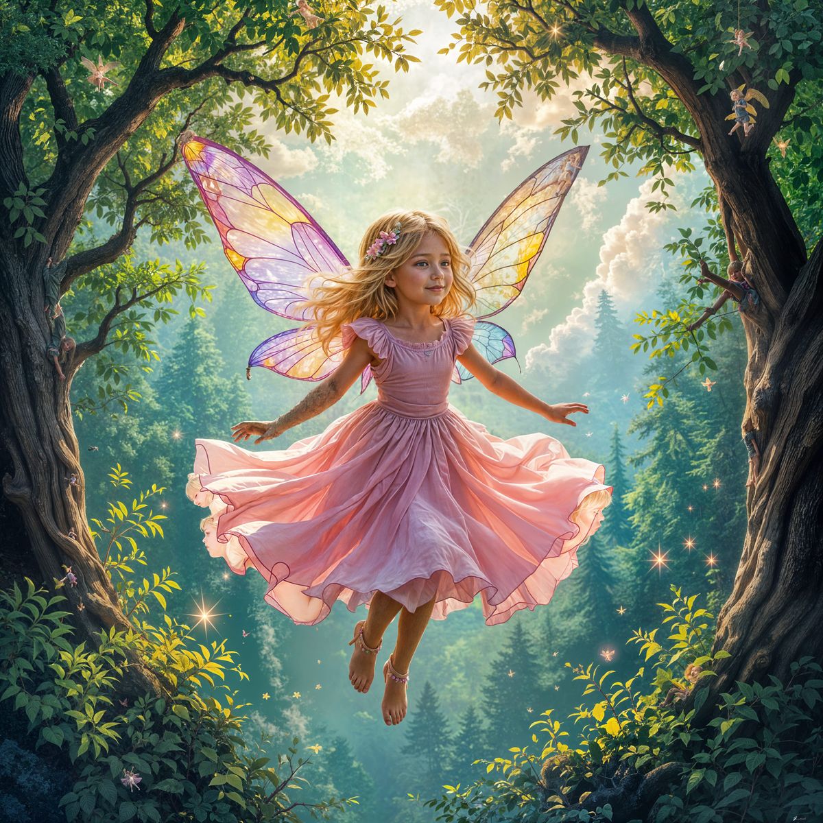 A magical image of a young blonde girl with fairy wings soaring above a pine forest. The enchanting scene captures the whimsical nature of childhood dreams.