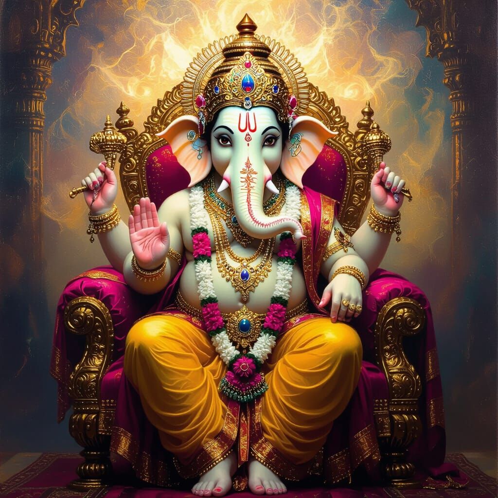 This image shows Lord Ganesha seated regally on a jeweled throne. The artwork features glowing elements and is rendered as a detailed oil painting with vibrant colors.