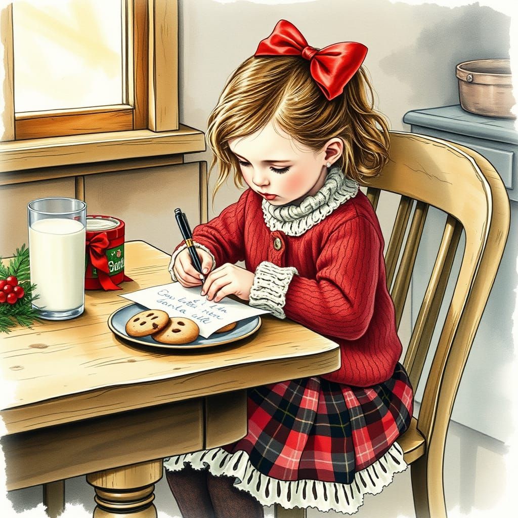 A heartwarming scene of a young girl writing a letter to Santa at her kitchen table, complete with milk and cookies. The image is rendered with watercolor textures and vintage aesthetics.