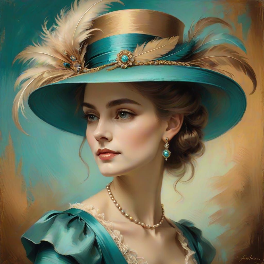 This oil painting portrait features a refined woman from the 19th century in a warm, golden light, with intricate details and luxurious textures. A beautiful feathered hat adorns her head, while her long eyelashes add to her classic beauty. The background features delicate turquoise undertones, gradating...
