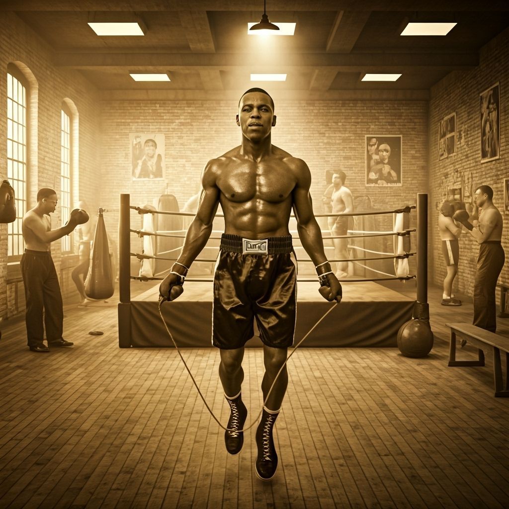 A sepia-toned, panoramic view of a bustling 1940s boxing gym. In the foreground, a legendary champion, reminiscent of Joe Louis, is skipping rope, his muscles defined by the gritty, low-key lighting. Sweat glistens on his brow, catching the light from a single, bare bulb overhead. In the midground, other boxers are engaged in old-school training methods: hitting heavy bags, sparring in a vintage ring with rope-bound corners, and doing calisthenics. The background features faded posters of historical boxing matches adorning the brick walls, with a hazy, smoke-filled atmosphere suggesting the passage of time and countless battles. Scattered around are worn leather equipment, wooden benches, and metal spittoons, adding to the authentic, time-worn feel.