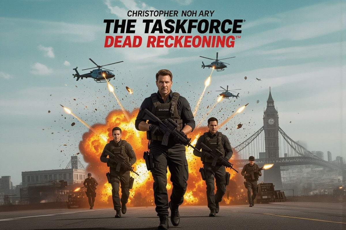 This image shows a dynamic movie poster reminiscent of Mission Impossible, titled 'The Taskforce Franchise'. It features high-action visuals and a suspenseful atmosphere.