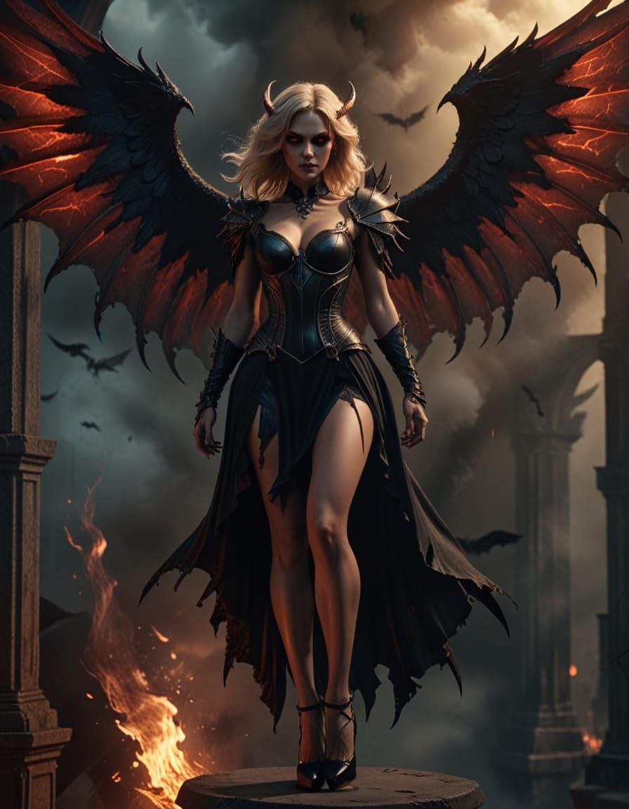 A hyper-realistic digital art piece showing a demonic woman with blonde hair and wings, wearing gothic attire. Features cinematic lighting and a smoky, dark atmosphere.