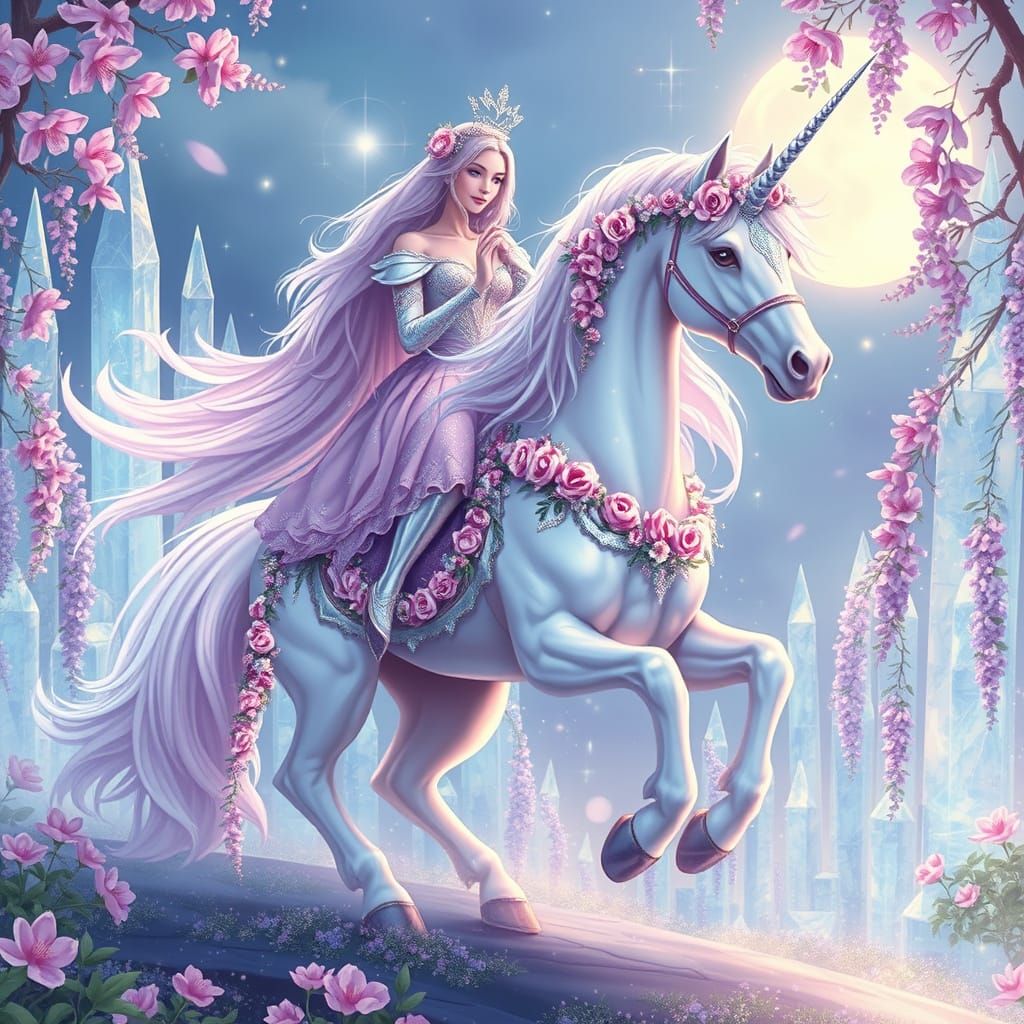 A beautiful alicorn in crystal armor surrounded by flowers trots through a crystal valley. A graceful enchantress rides the alicorn in an iridescent gown, rendered with cinematic fantasy illustration.