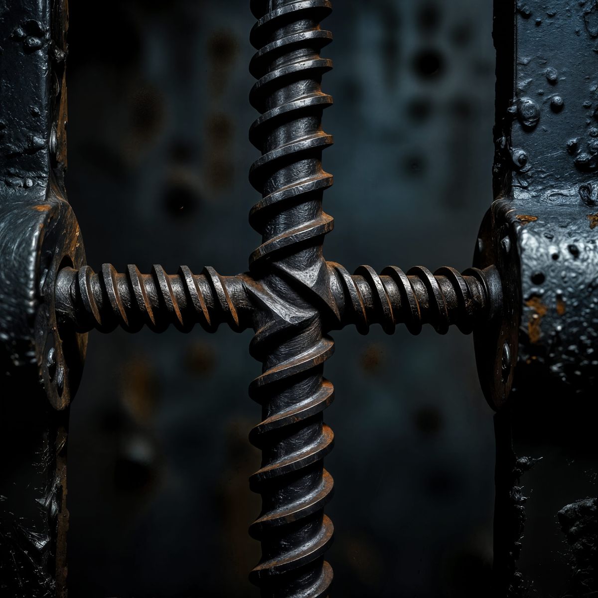 cold-forged steel glinting under dim light, spiraling threads of precision and purpose, the poetry of pressure and alignment, tension between permanence and decay, rust creeping through forgotten joints, mechanical grace in motionless form, metallic whispers of creation and collapse, unity born from ...