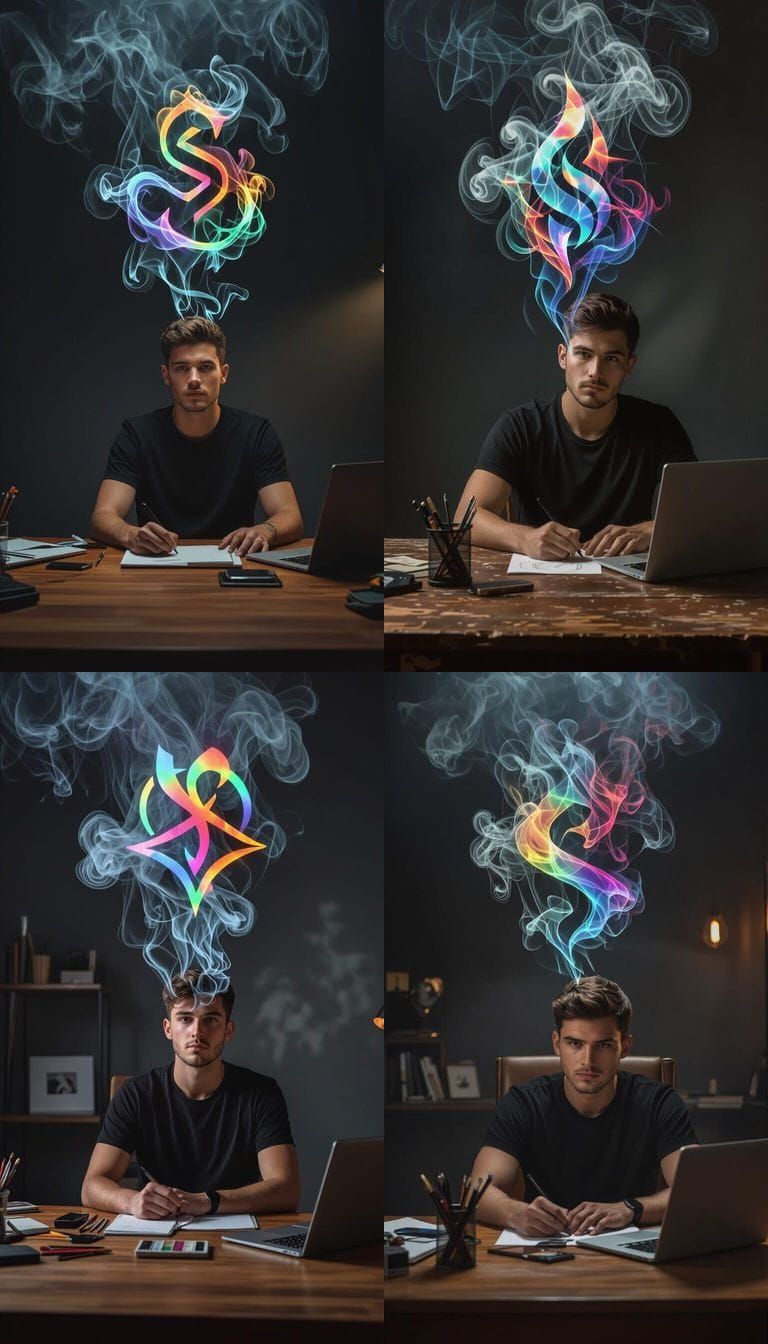 This ultra-realistic image shows a young man sketching at a desk with a laptop. Colorful mist forms an abstract logo above his head, set in a dramatic, cinematically lit studio.