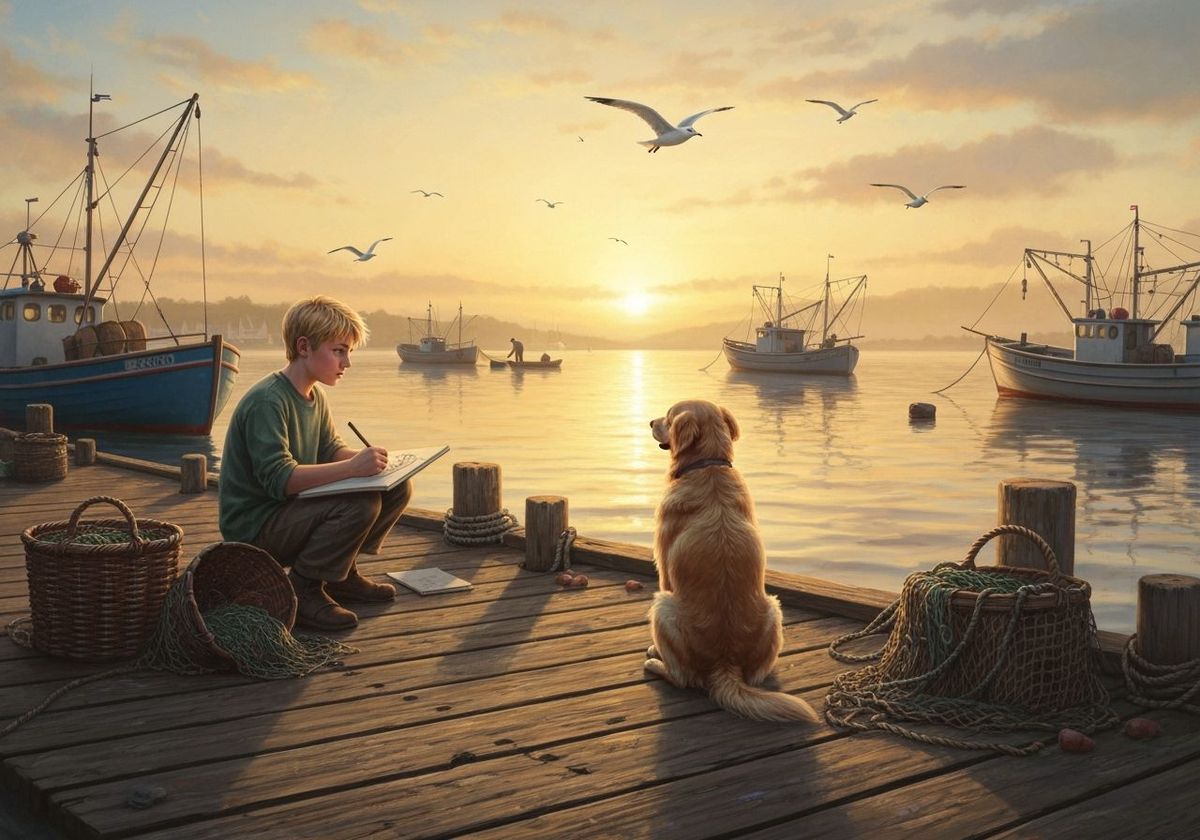 This image shows a young boy sketching boats on a dock at sunrise, with his golden retriever companion. The scene captures the quiet rhythm of coastal life with fishing gear and boats in painterly realism.