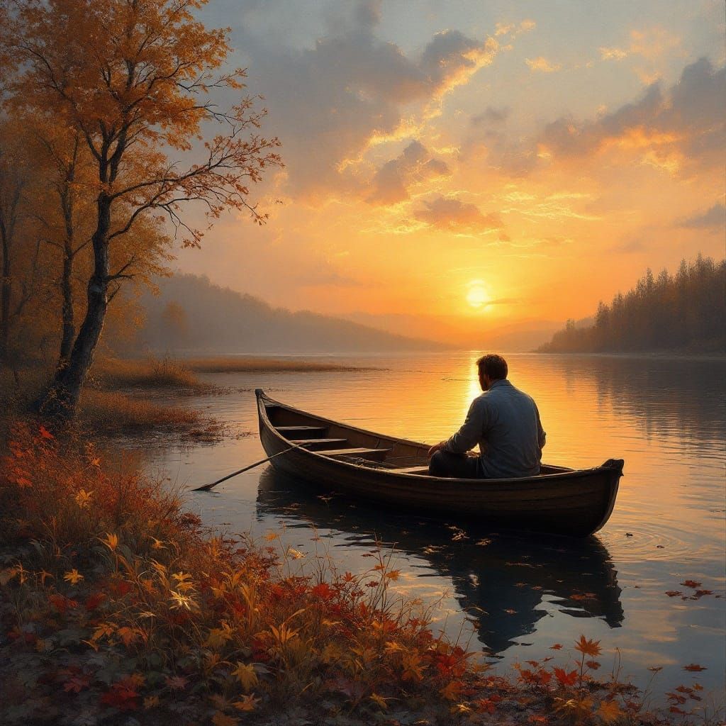 This image shows a solitary figure in a boat on a tranquil lake. The scene is bathed in the warm hues of an orange sunset, surrounded by autumn colors, and rendered as a realistic digital painting.