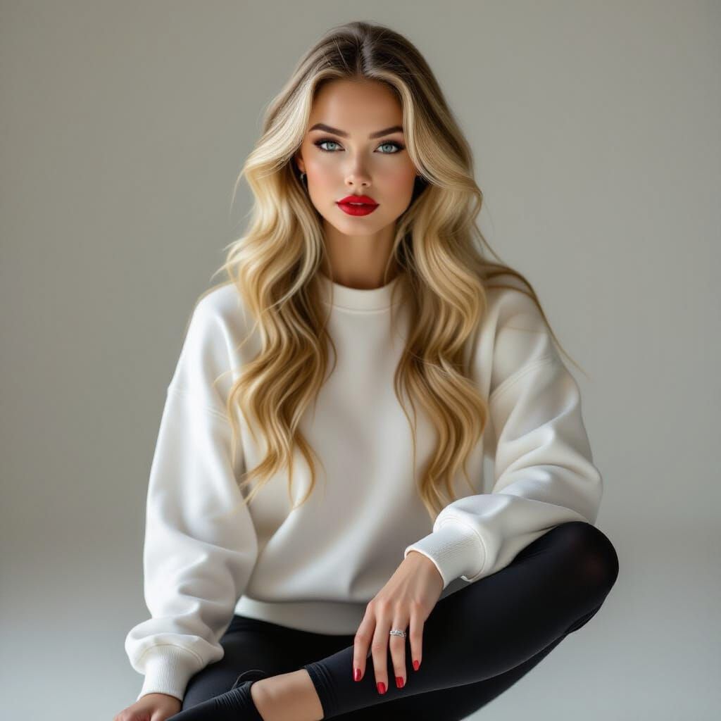 This image shows a blonde ballerina en pointe in black ballet shoes, wearing a white silk sweatshirt and black leggings. The photorealistic image captures a dominant presence with dramatic lighting, reminiscent of high-fashion portraiture.
