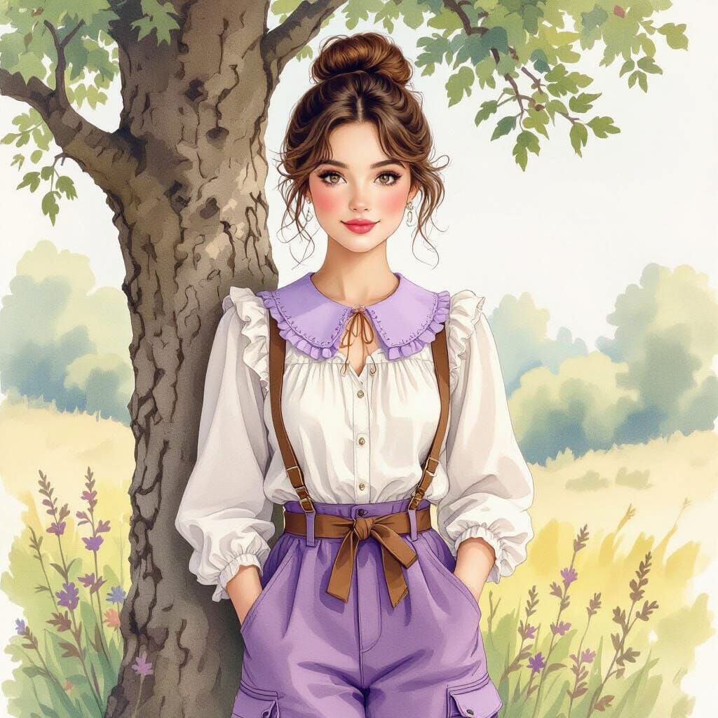 A charming watercolor painting of a young woman with brown hair, wearing a ruffled white blouse and purple cargo pants. Rendered in a soft, dreamy style with delicate colors.