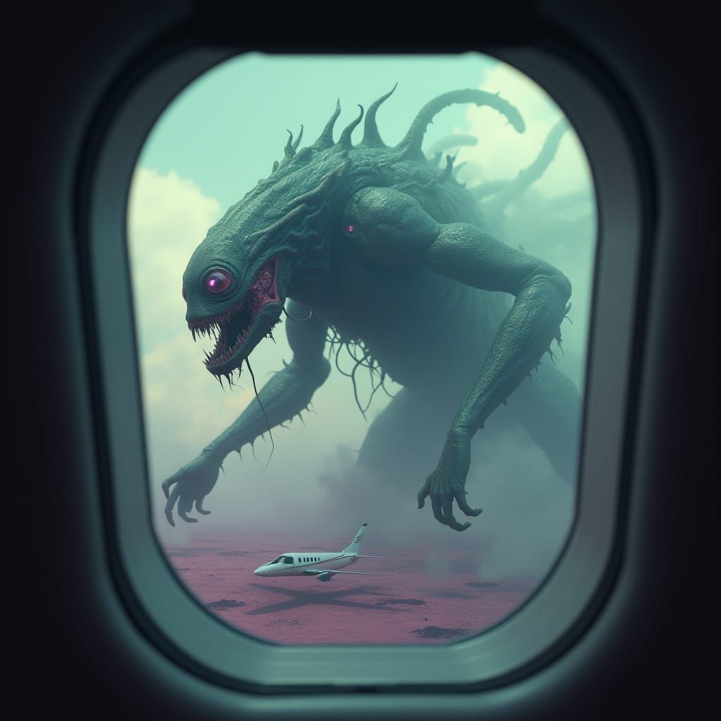 This image shows a grotesque alien creature leaping from a desolate landscape towards an airplane, depicted in a high-contrast digital matte painting style with eerie lighting and a vivid color palette.