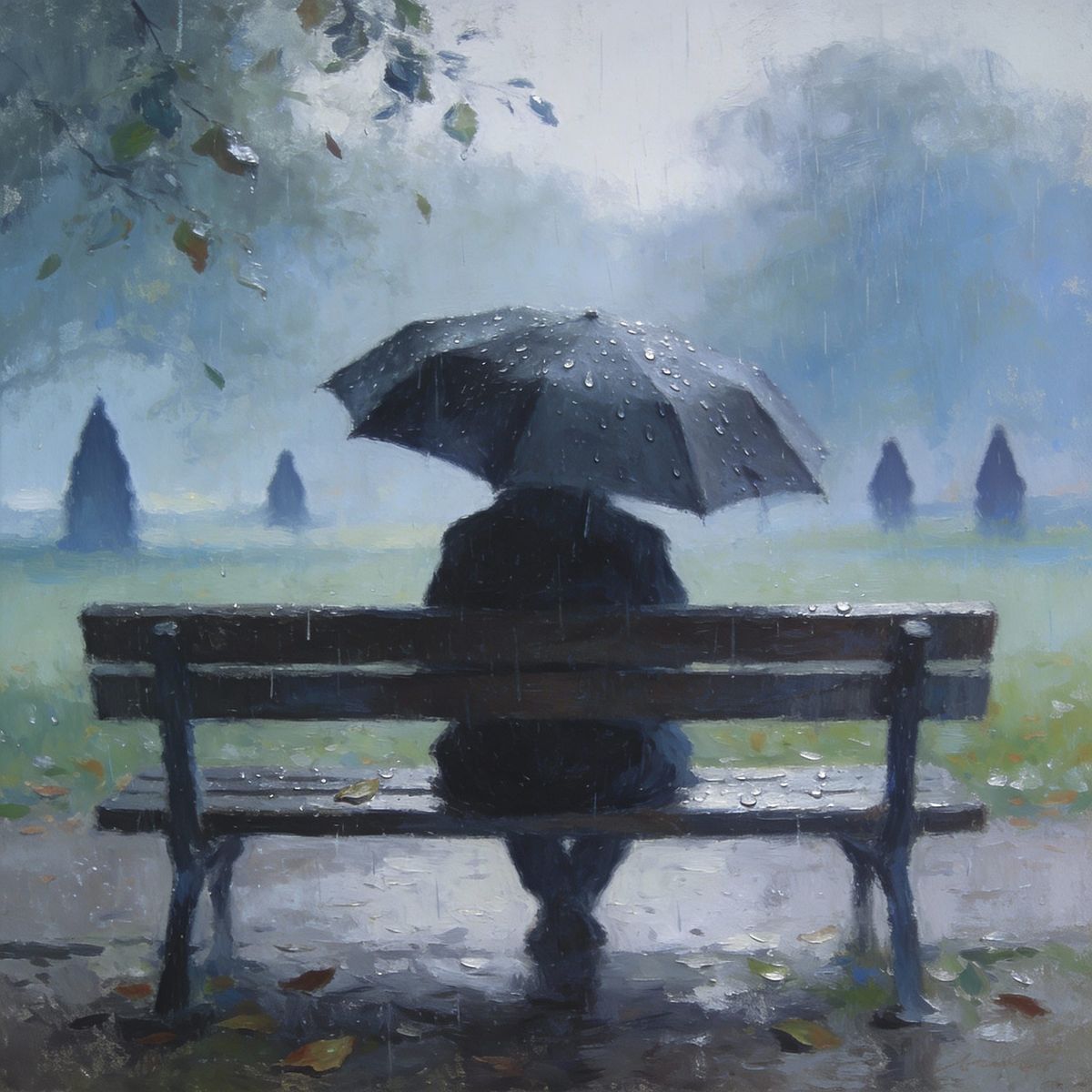 This image depicts a person with an umbrella on a park bench during a gentle rain. It is rendered in a soft, painterly impressionistic style with muted colors, evoking a mood of quiet reflection.