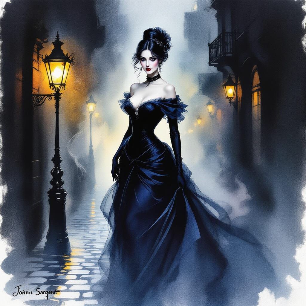 This watercolor painting captures a striking woman in a dark, gothic style. She wears a flowing blue gown, with shadows accentuating her features under a gas lamp's glow.