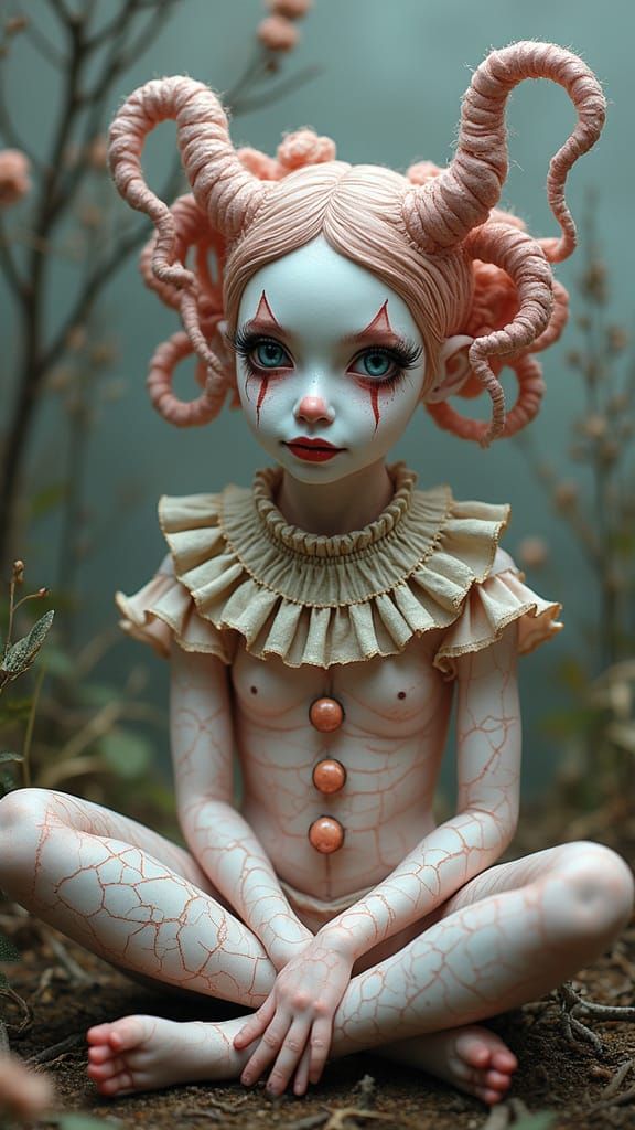 A surreal harlequin with porcelain skin sits cross-legged. The image shows cracked skin filled with gold, jester makeup, and cotton candy hair in a panoramic wonderland as digital art.