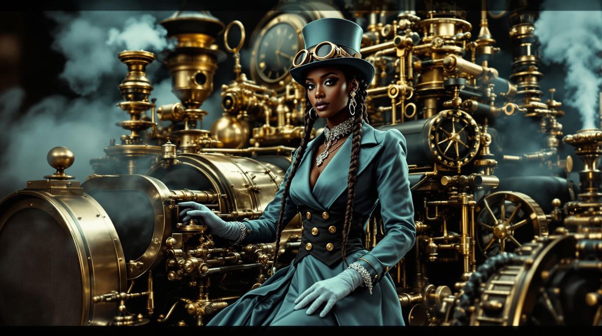 A stunning woman in a silk dress and top hat stands beside her intricately designed steampunk car, surrounded by brass machinery and clockwork, in a photorealistic style reminiscent of editorial photography