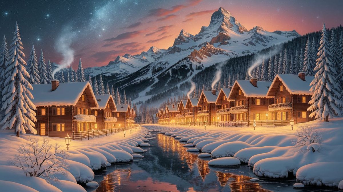 This image depicts a serene snowy alpine village at night. Cozy chalets glow with warm light, illuminating streets and a frozen river under a starry sky, rendered with vibrant impasto brushwork.