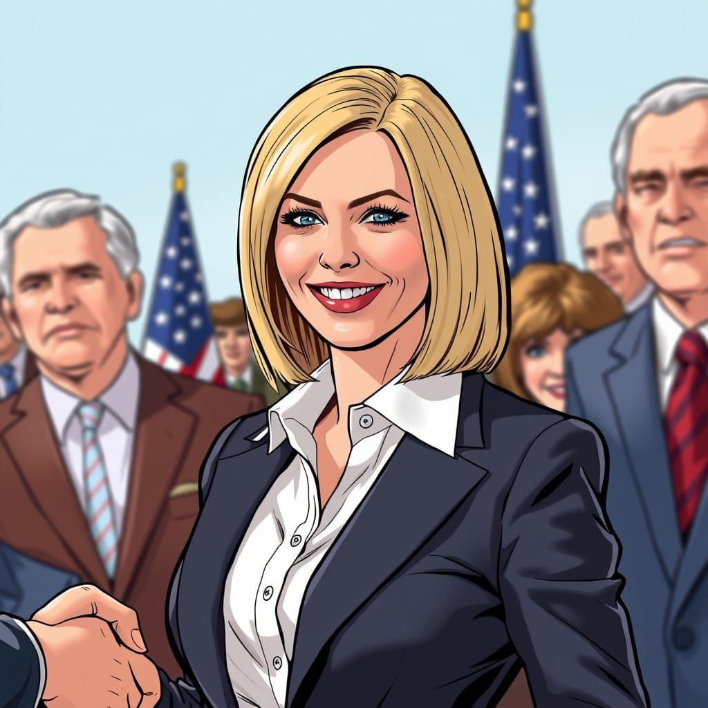 This image shows a poised Republican politician with a sleek bob and stylish outfit, exuding authority and charisma in a vibrant comic book art style.