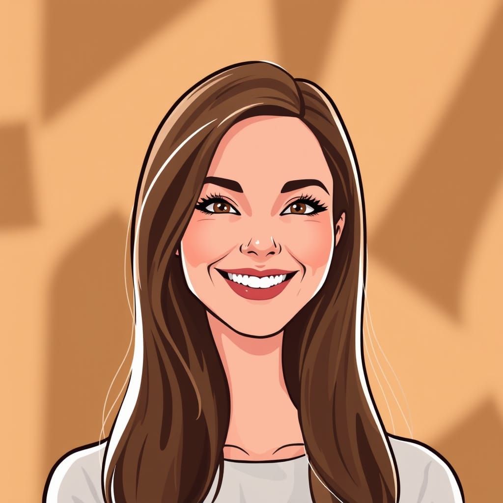 This image features a smiling woman with long brown hair, depicted in a clean vector art style. Soft lighting enhances her features against a blurred geometric background in brown and tan tones.