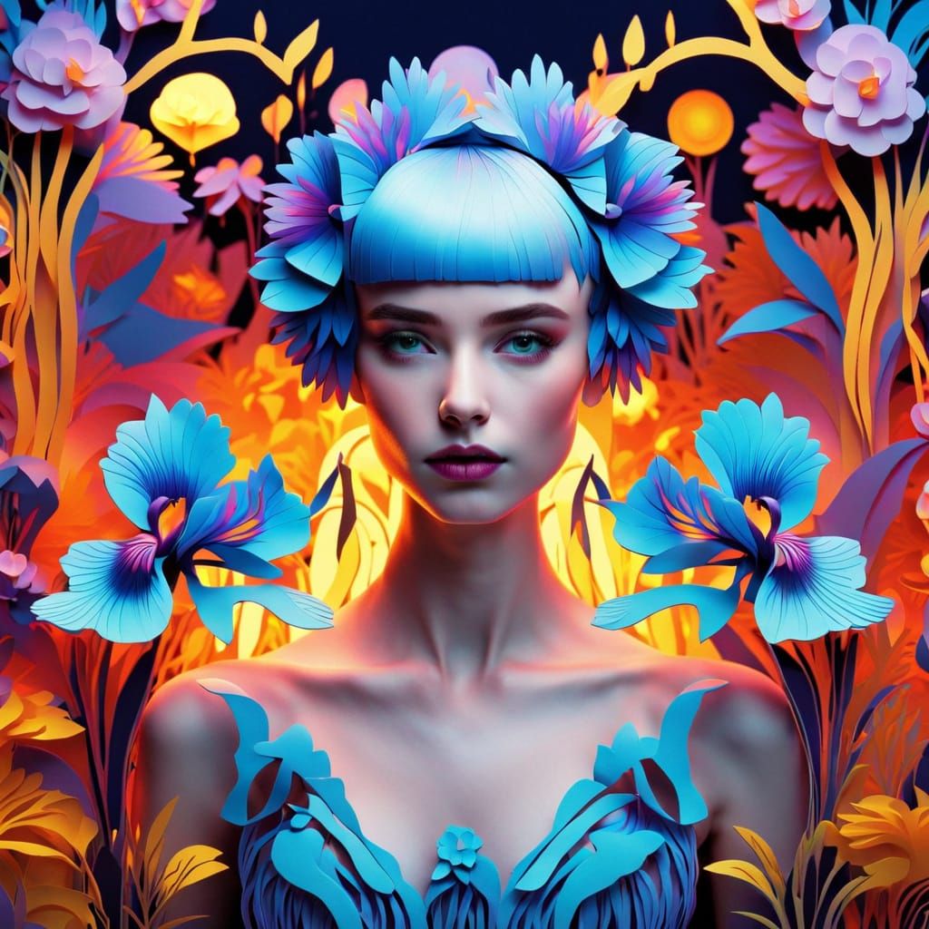 This image shows a gothic girl standing in a fantastical garden illuminated by neon lights. The scene blends traditional paper art with modern technology, reflecting vibrant colors in her eyes. The style is reminiscent of Kirigami paper art.