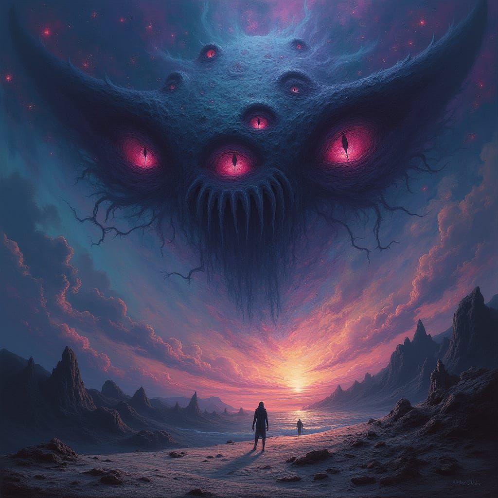 A surreal image of eyes emerging from psychedelic skies. The picture features vibrant colors and otherworldly light in a dark, mystical style, as 3d rendered digital art.