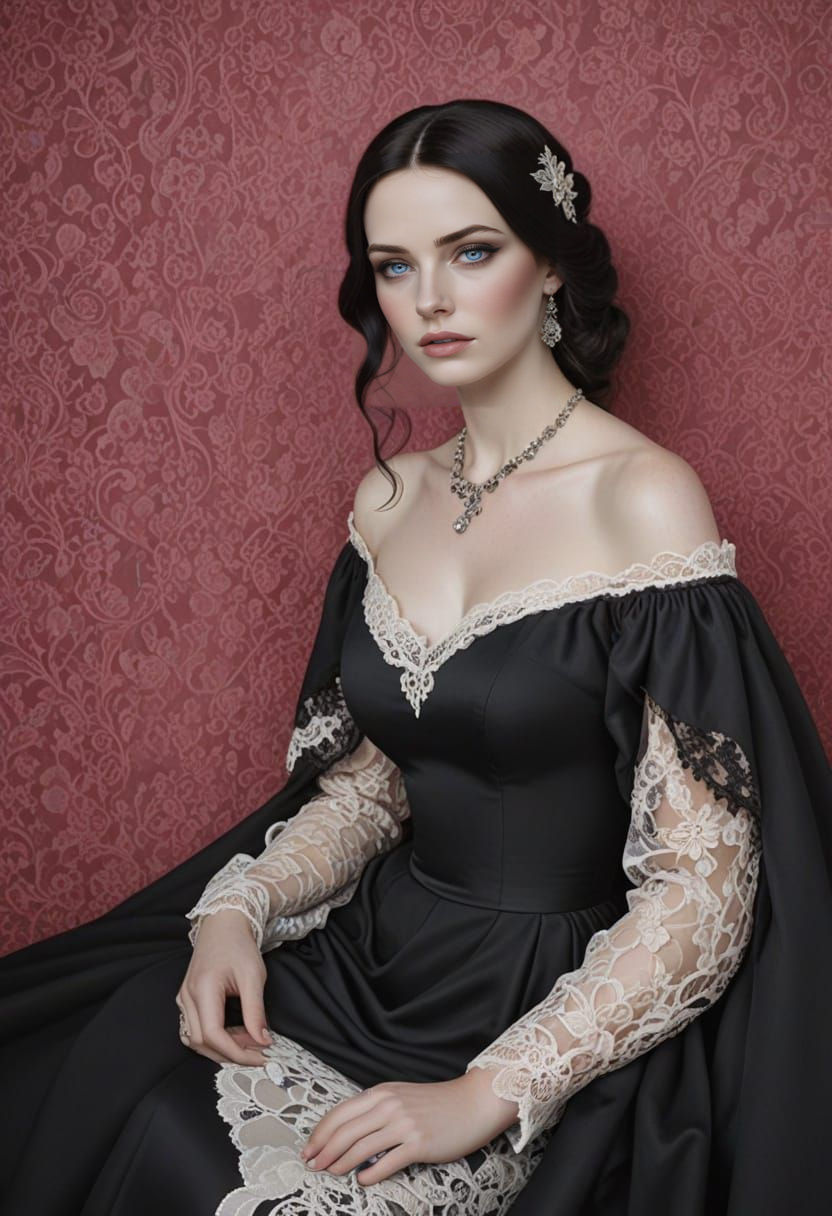 "Photorealistic image of beautiful woman with porcelain skin, blue eyes, and straight black hair, wearing a flowing black classical dress with intricate lace details on the dress, posing with poise and confidence"