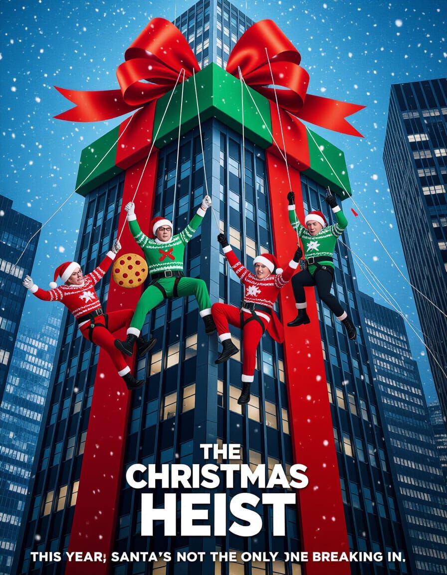 A holiday movie poster depicts misfit thieves in ugly sweaters rappelling down a skyscraper wrapped as a present. Cinematic action with a mischievous, sparkling holiday mood.