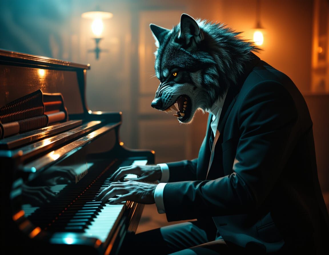 This image shows a werewolf in a suit intensely playing a rock piano in a dimly lit room. The image is reminiscent of a cinematic film still with deep blues and oranges.