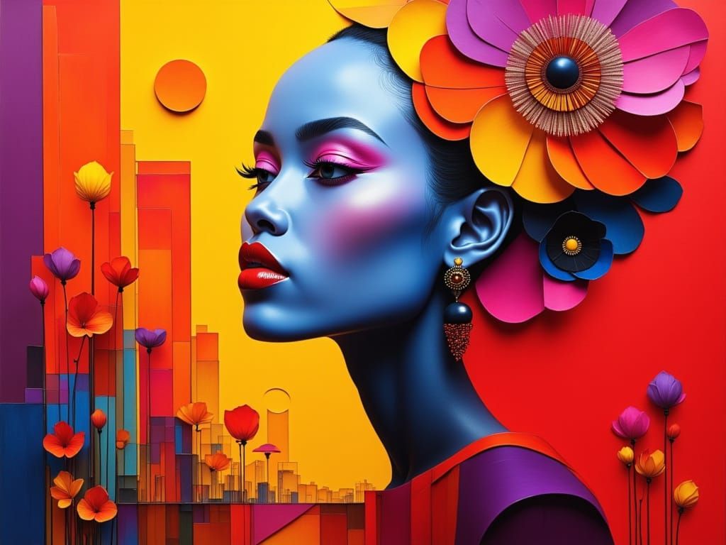 This image features a striking abstract portrait of an African Caribbean face sculpted from alabaster-like material, set against a vivid red background with a multicolored cityscape. The art style is imaginative and expressive, blending vibrant colors and fluid shapes.
