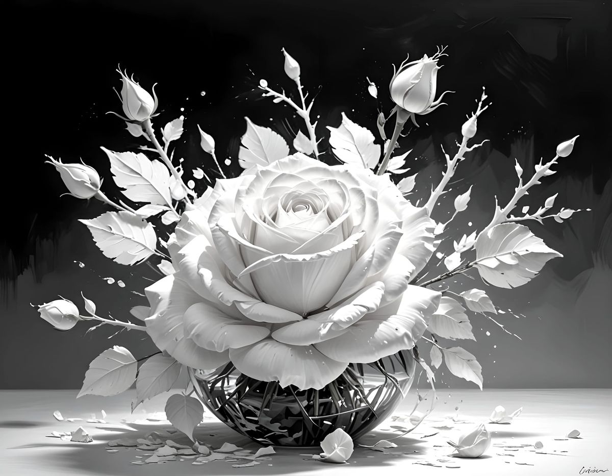 This image features a 3D rendered rose in an oil painting style, showcasing the versatility of white with intricate details and textures. It highlights the interplay of light and shadow within a full spectrum of white shades.