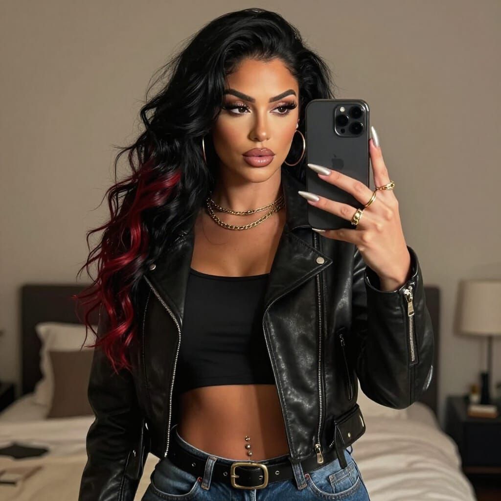 A hyper-realistic portrait of a woman taking a mirror selfie. Features authentic skin texture, detailed makeup, and stylish attire in a cinematic editorial aesthetic.