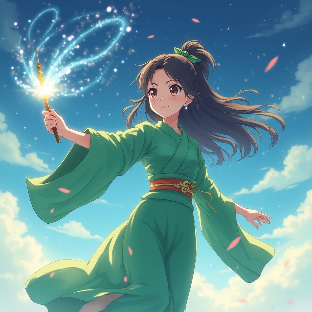 This image depicts an anime magical girl in a green kimono, casting spells with a sparkling wand against a pastel, star-filled sky, rendered in a vibrant, cel-shaded anime style.