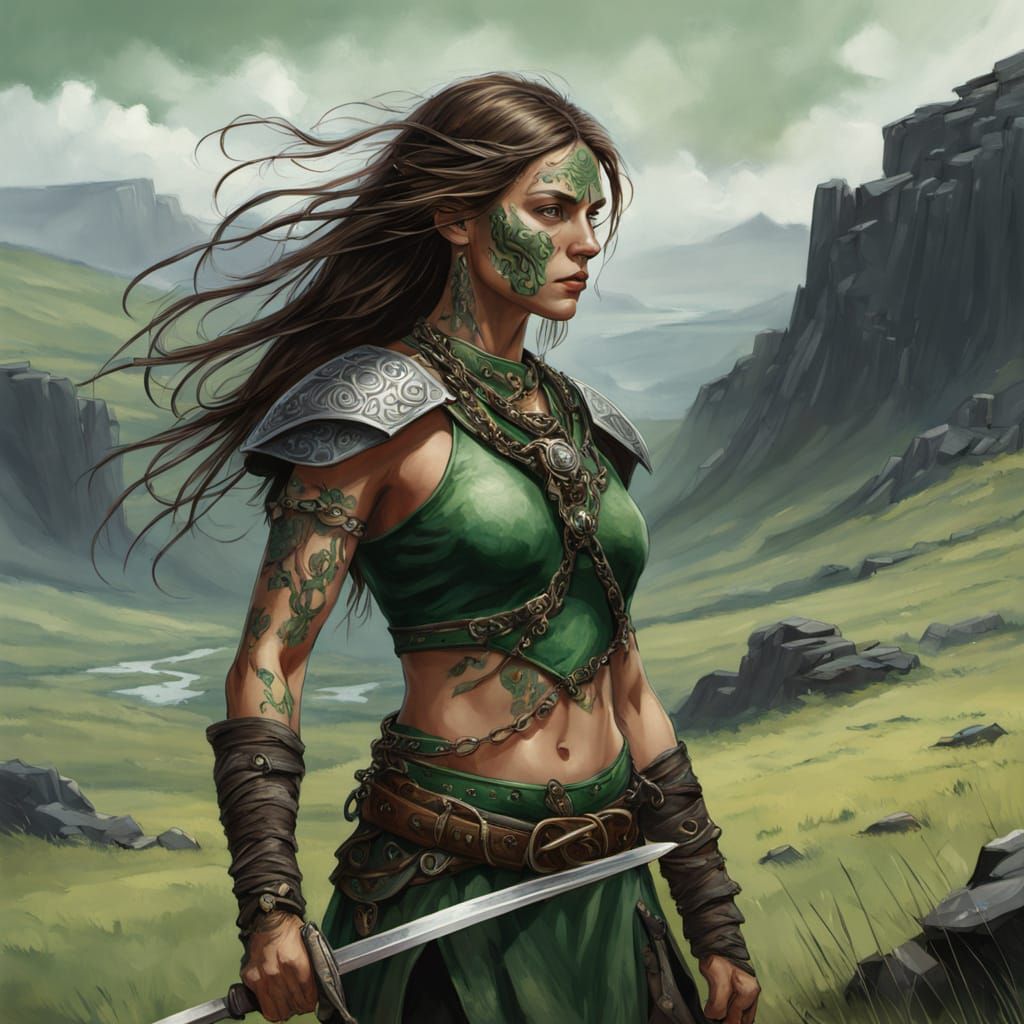 This image shows a determined Pictish warrior on a moor, decorated with green body paint. The historical fantasy art evokes a gritty, realistic atmosphere with authentic details.