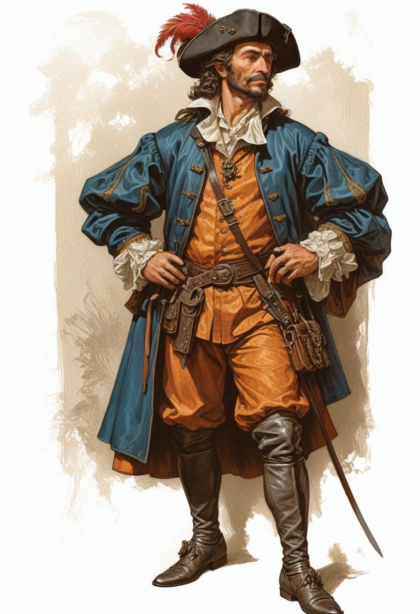 This image shows a proud French courtier from 1625, an RPG character in expensive clothes. A highly detailed full color illustration with black outlining and vivid colors.