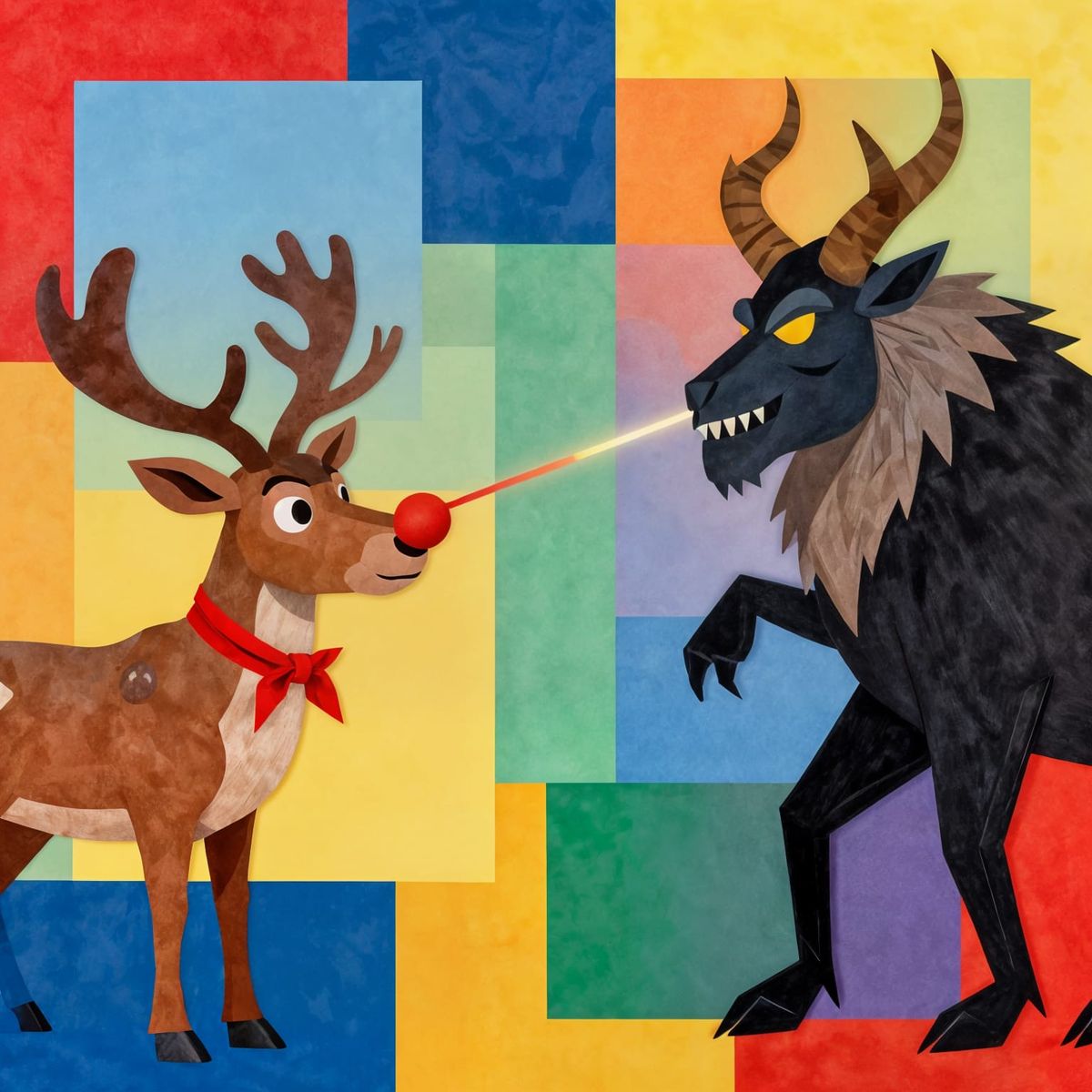 Collage Style. A multicolor palette is dominant. Different color squares of paper layered to create Rudolph Shooting Krampus with a Laser from his Red Nose.