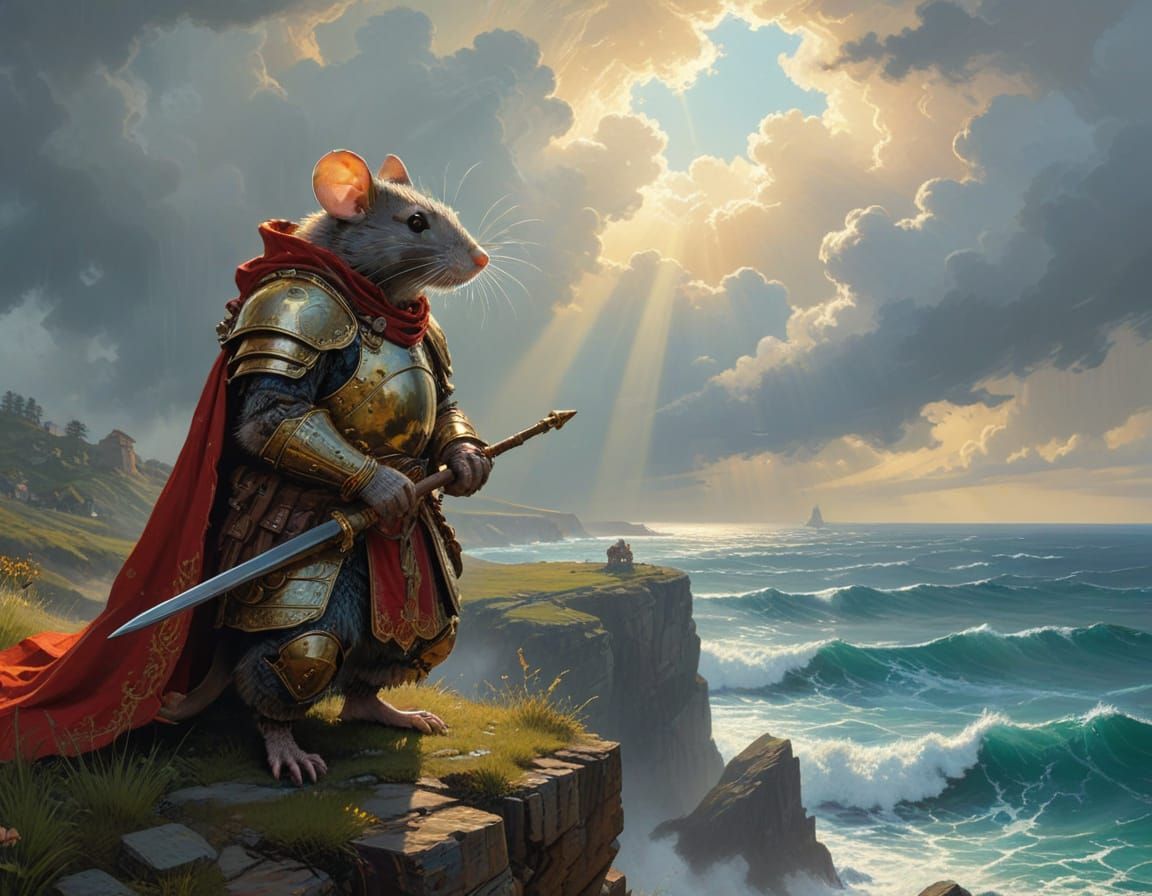 A mischievous rat, clad in baroque armor, stands on a windswept cliff overlooking a stormy seascape. The scene is illuminated by dramatic god rays piercing through the clouds, highlighting the intricate details of the armor and the rat's determined expression. The style is reminiscent of Frank Frazetta ...