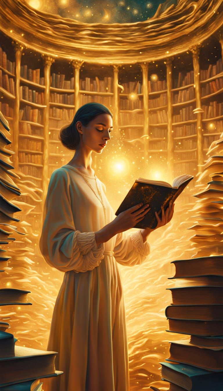 A surreal image showing a person holding a book in a vast library filled with cosmic dust. The dreamlike illustration features golden light and vibrant colors in a mystical atmosphere.