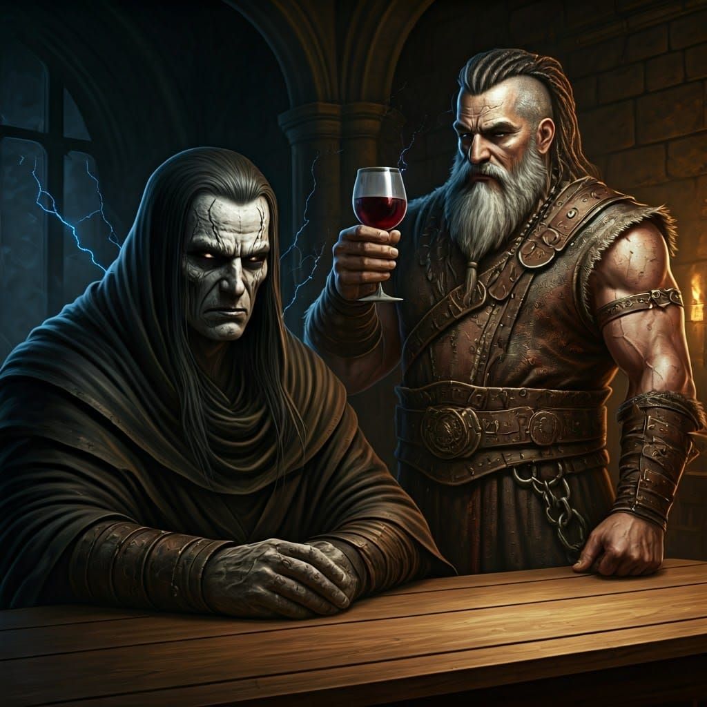 A dramatic painting of two powerful men, one a dark sorcerer with electrifying hair and a stern face, the other a battle-hardened warrior in leather and chains, clinking glasses in a dark castle.