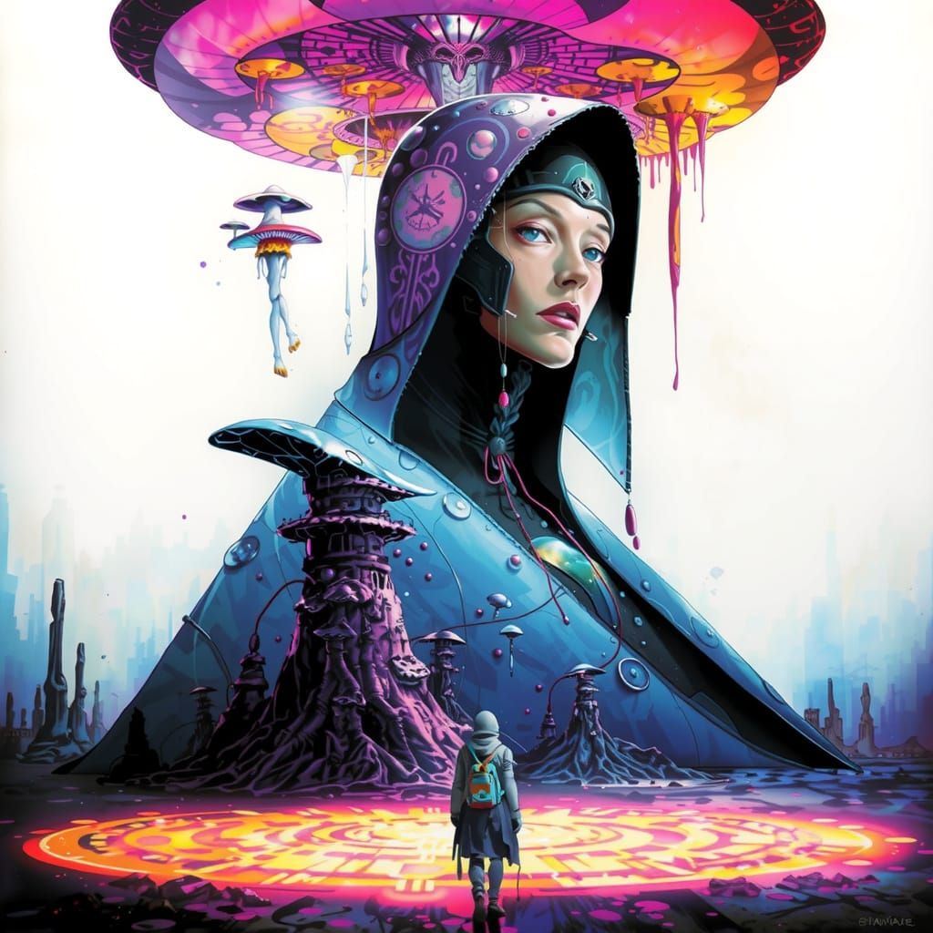 A futuristic, biopunk Art Nouveau image of the Spirit of Misfortune. The image blends psychedelic elements with a Moebius-inspired aesthetic.