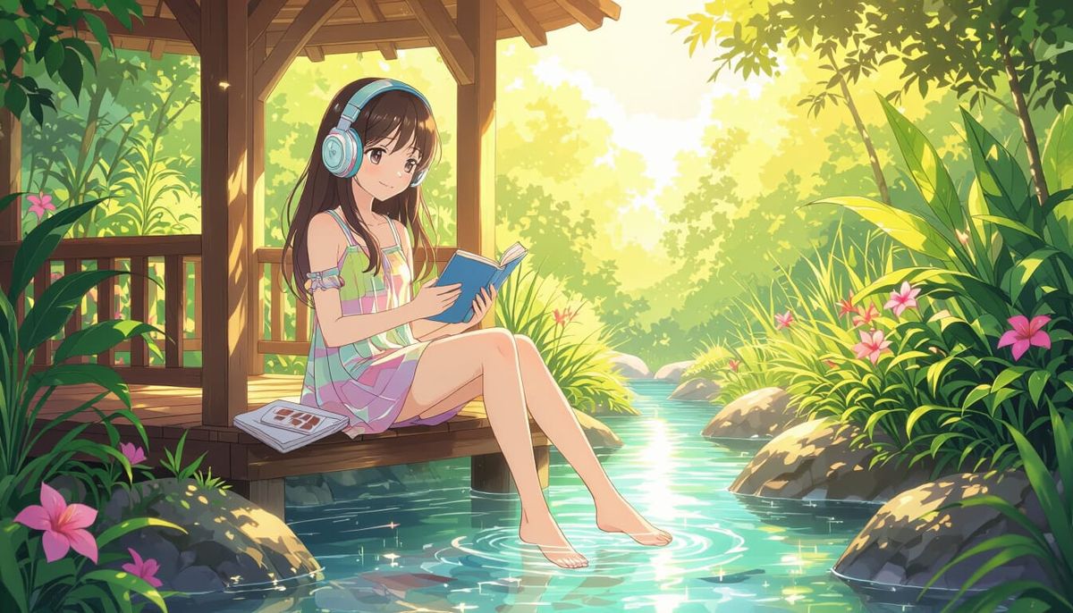 A vibrant anime-style summer scene shows a girl on a gazebo with her feet in a stream. Lush plants, flowers, and art supplies create a peaceful ambiance in bright, soft colors.