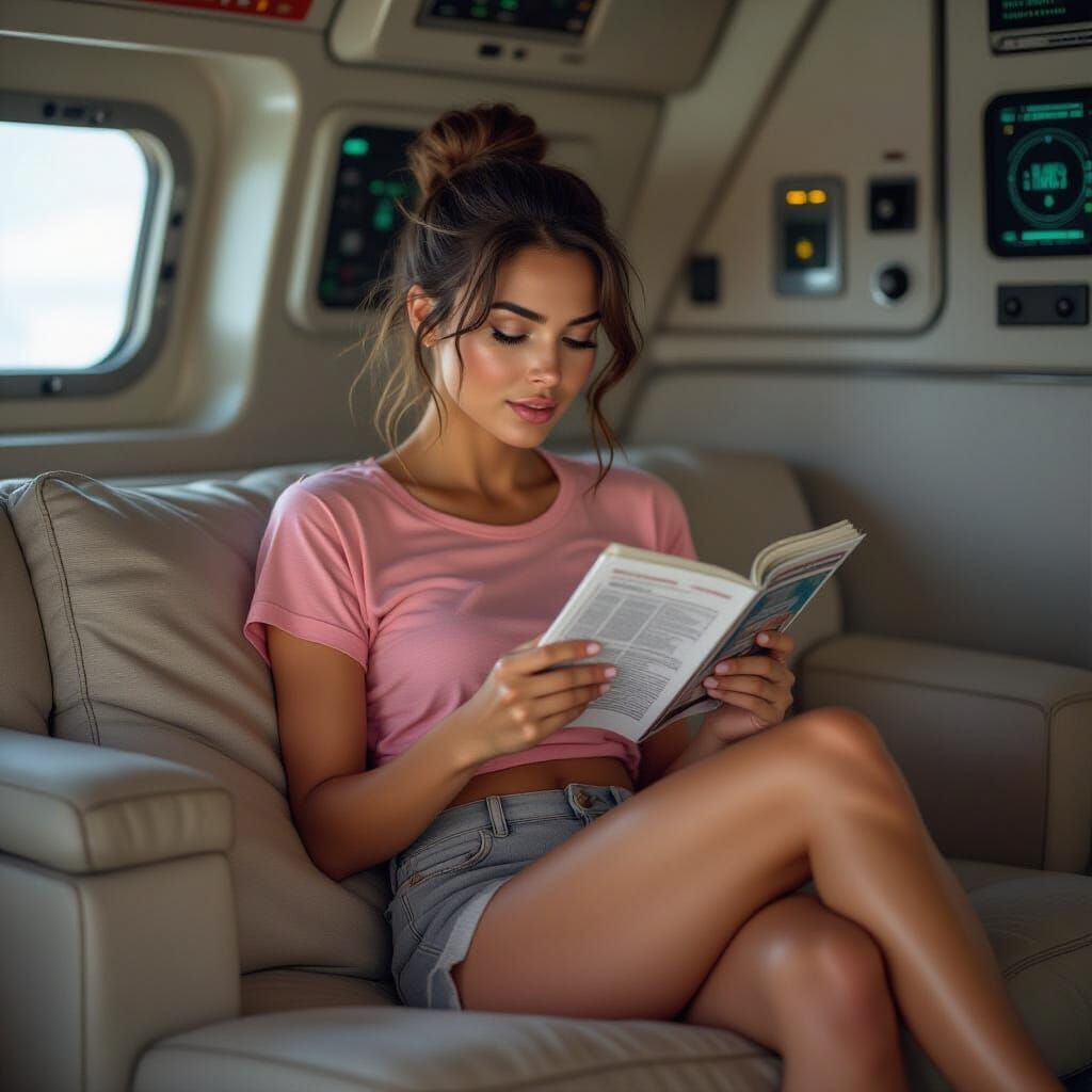This image shows a half-human, half-alien woman relaxing in her starship quarters. The digital art evokes cinematic realism with dramatic lighting and a retro science fiction aesthetic.